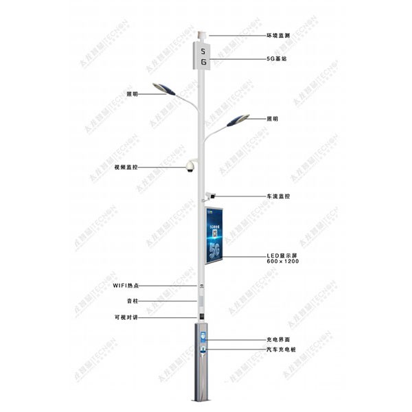 所謂智慧城市建設(shè)設(shè)備5G綜合桿就是傳統(tǒng)燈桿上集成多種功能設(shè)備,讓燈桿實現(xiàn)“一桿多用”,不在局限于單一的照明。比如說圖中展示:汽車充電樁、可視對講、WiFi熱點、信息發(fā)布屏(LED燈桿屏)、車流監(jiān)控、視頻監(jiān)控、主輔智能照明、5G基站以及各項環(huán)境檢測等,然后利用物聯(lián)網(wǎng)及互聯(lián)網(wǎng)技術(shù)實現(xiàn)智能化管理。讓普通燈桿升級為智慧城市信息采集的5G綜合桿、便民服務(wù)終端。
